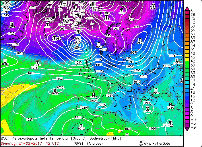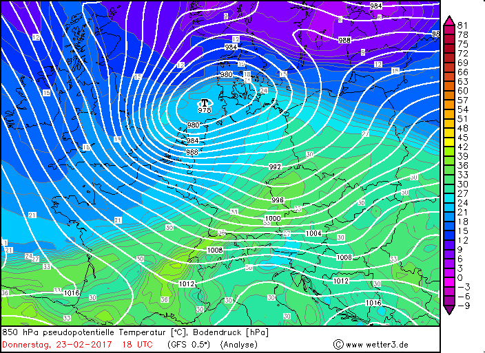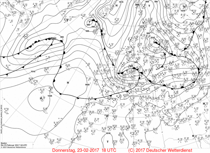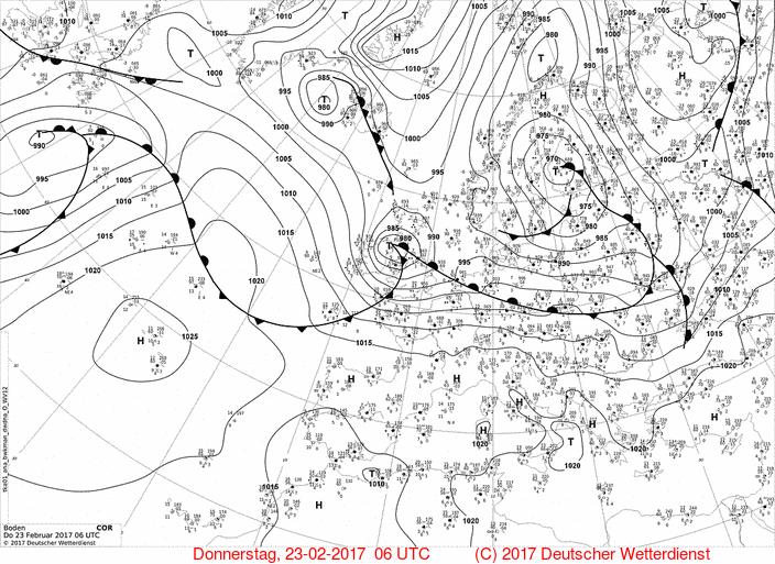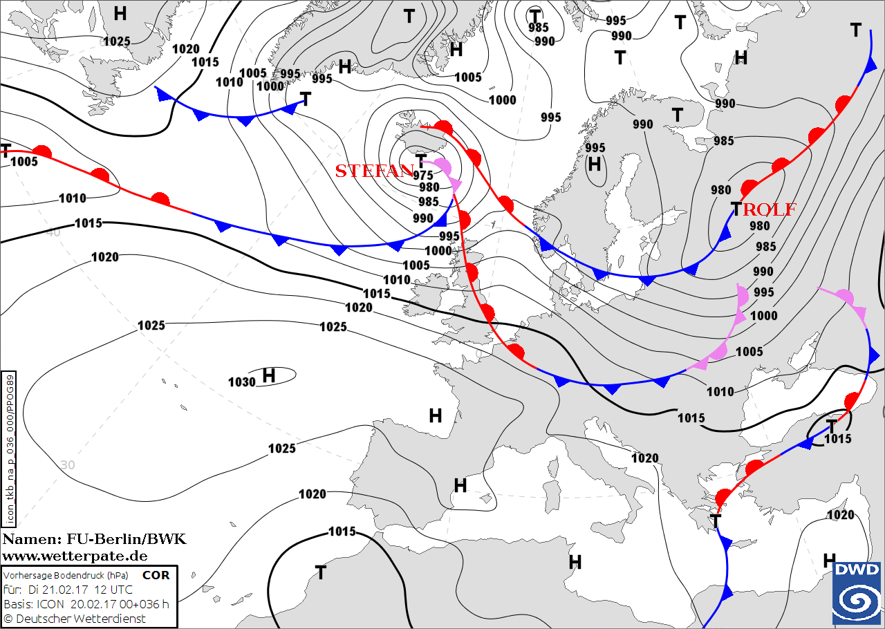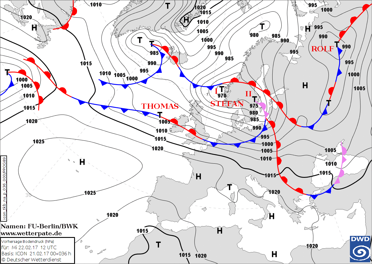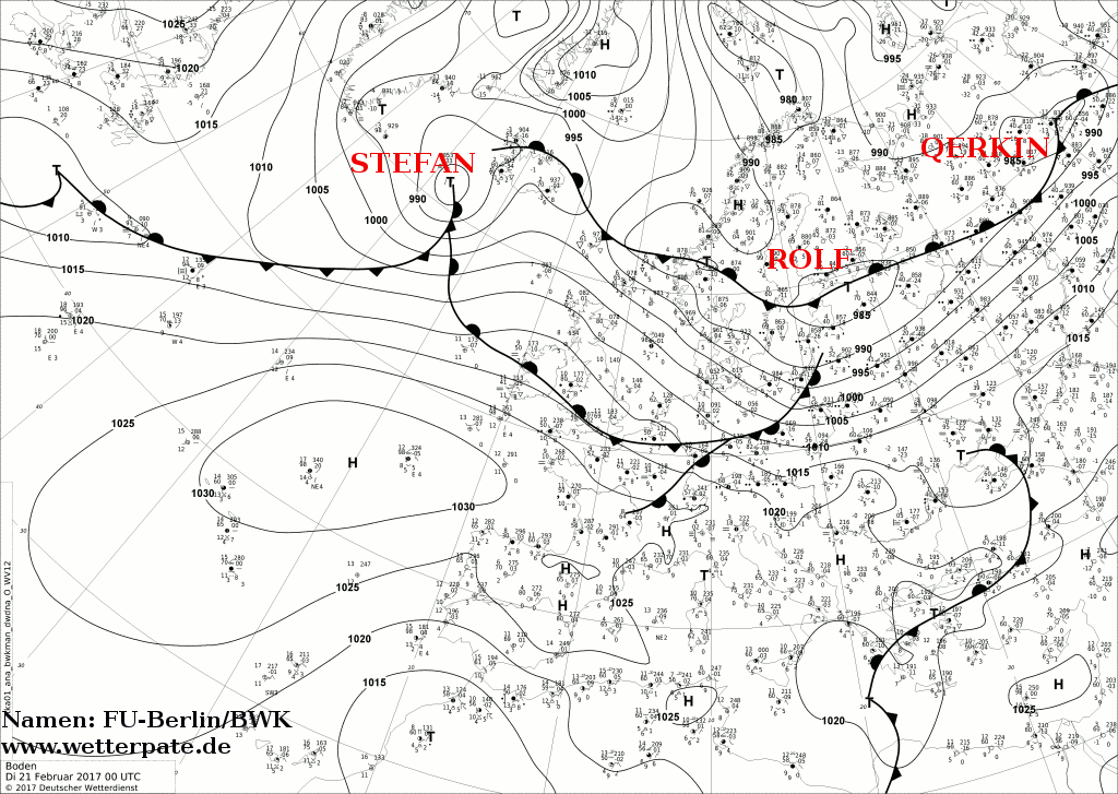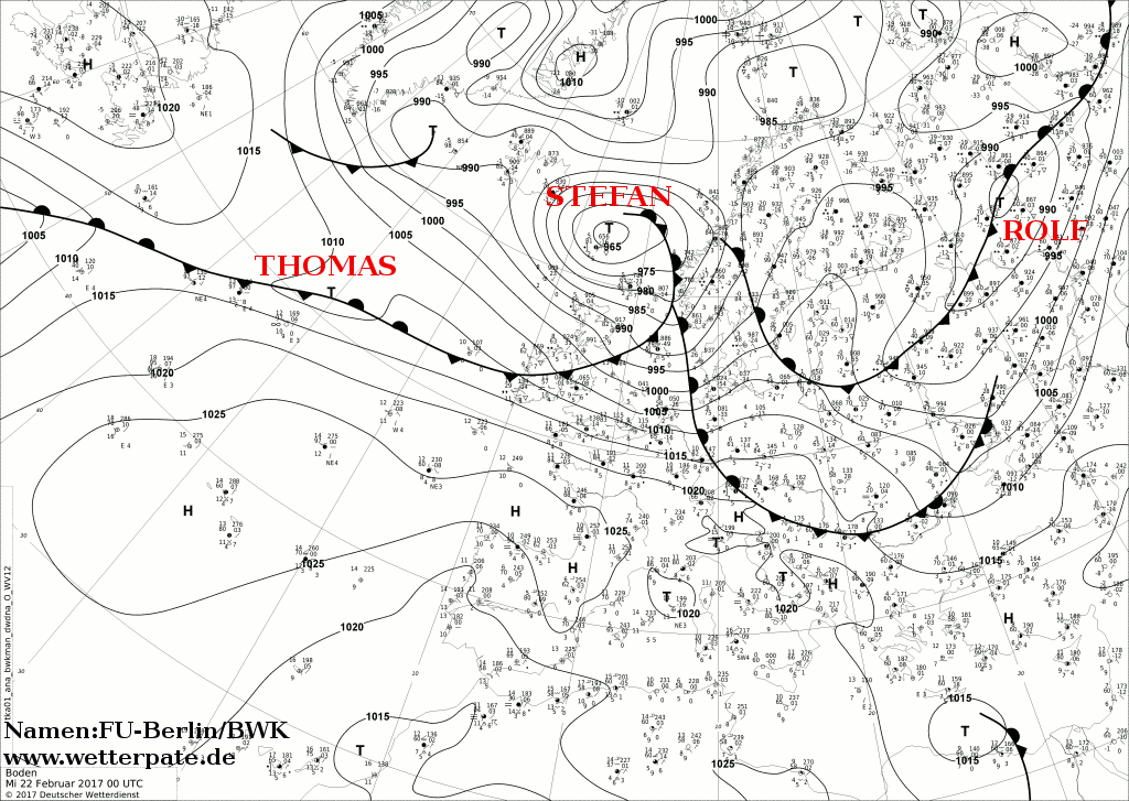 Wetterlage und Entwicklung Zur Monatsmitte des Februars 2017 dominierte mit "Erika" ein kräftiges Hochdruckgebiet das Wettergeschehen in Mitteleuropa. Am 16.02. schob sich der zugehörige Rücken weiter in den Osten Europas, sodass vom Atlantik ein Höhentrog nach Mitteleuropa vorstoßen konnte. Der Trog kam in der Folge weiter in den Südosten Europas voran. Am Boden stellte sich erneut hoher Luftdruck (Hoch "Felicitas") ein. Mit Tief "Querkin", welches vom 16.02. bis zum 18.02. vom Nordwestatlantik bis nach Norwegen zog, veränderte sich das Strömungsmuster über dem nördlichen Mitteleuropa allmählich. Über Nordeuropa entwickelte sich nach dem Durchzug von "Querkin" eine kräftige Frontalzone, die durch einen Warmluftvorstoß über dem Atlantik (10 °C in 850 hPa bei ca. 52 °N) verstärkt wurde. Tief "Rolf" bezog die erwähnten warmen, subtropischen Luftmassen in seine Zirkulation mit ein und verlagerte sich am 19.02. und 20.02. zunächst von Island bis in die Mitte Norwegens. Dabei erreichte der Druckgradient zwischen dem Azorenhoch (1030 hPa) und "Rolf" ca. 40 hPa. Der Jetstream reichte am 20.02. mit einem Maximum von 130 kn (240 km/h) von Neufundland über den Atlantik und Skandinavien bis weit in den Osten Russlands. In dieser fast schon geradlinigen Westströmung waren die Entstehungsbedingungen für Sturmtiefs sehr günstig. Ein Kaltluftvorstoß westlich von Grönland ließ an diesem Tag über dem Nordatlantik Tief "Stefan" entstehen. Hebung an der Vorderseite des zugehörigen Höhentroges sorgte für einen raschen Druckfall im Zentrum des Tiefs (ca. 20 hPa in 24 Stunden). "Stefan" zog von Island über das Nordmeer in Richtung Skandinavien. Starke Divergenz in der Höhe im Ausströmbereich des Jetstreams an der Südostflanke von "Stefan" sorgte am 22.02. für die Entstehung eines zweiten Zentrums über Südschweden. Über Skandinavien liegend hatte das Tiefdruckgebiet seinen Entwicklungshöhepunkt erreicht und schwächte sich nachfolgend bei leichter nördlicher Verlagerung zunehmend ab. Nach Sturmtief "Stefan" befand sich die Frontalzone weiter im Süden als zuvor. Kräftige Höhenwinde herrschten von Großbritannien über die Nordsee bis nach Deutschland und Polen vor.