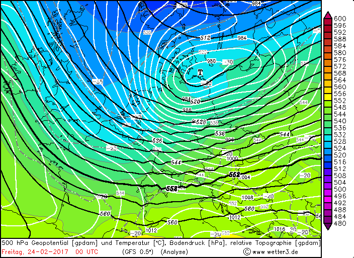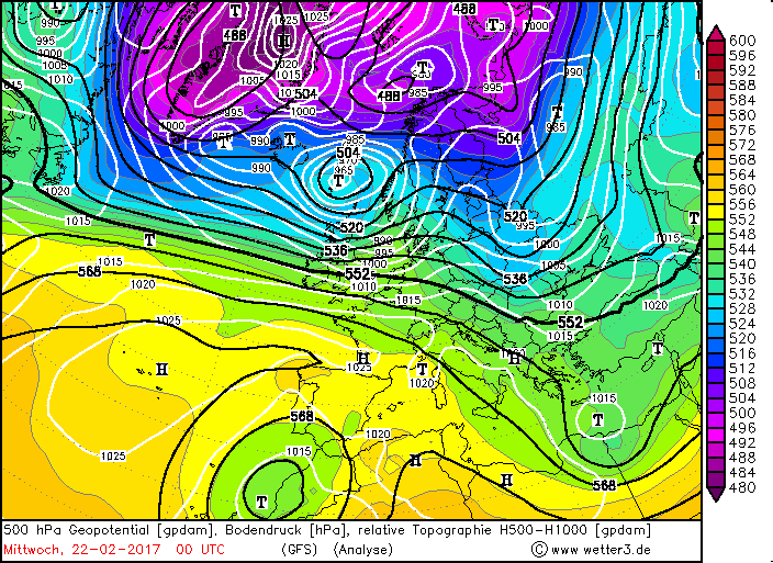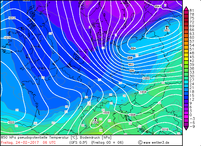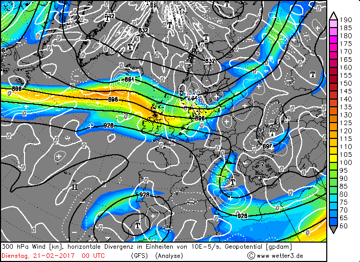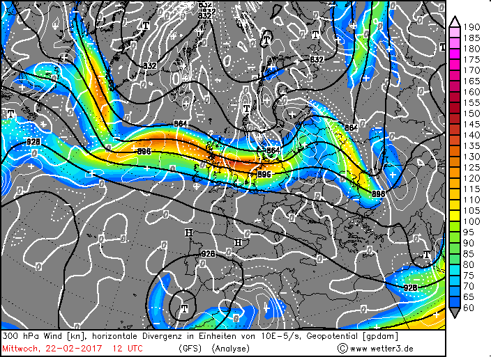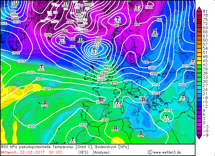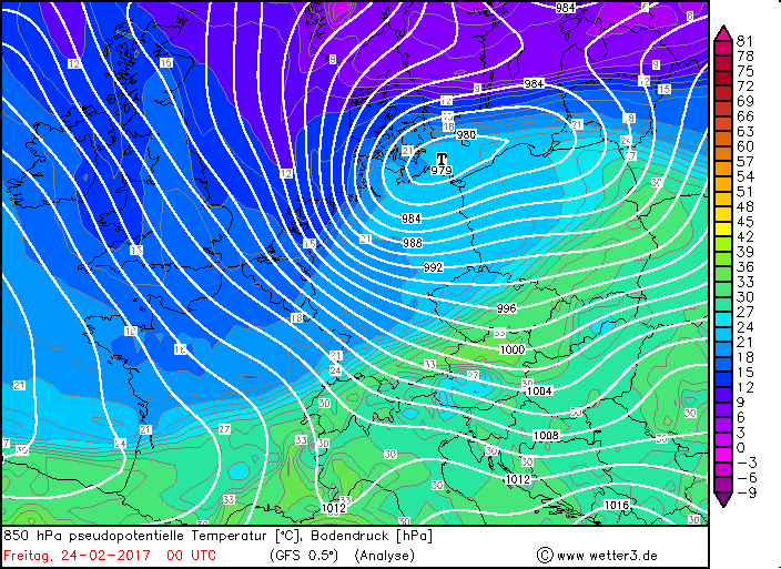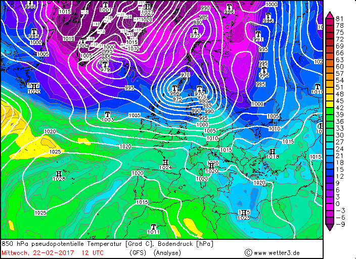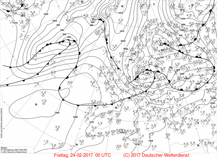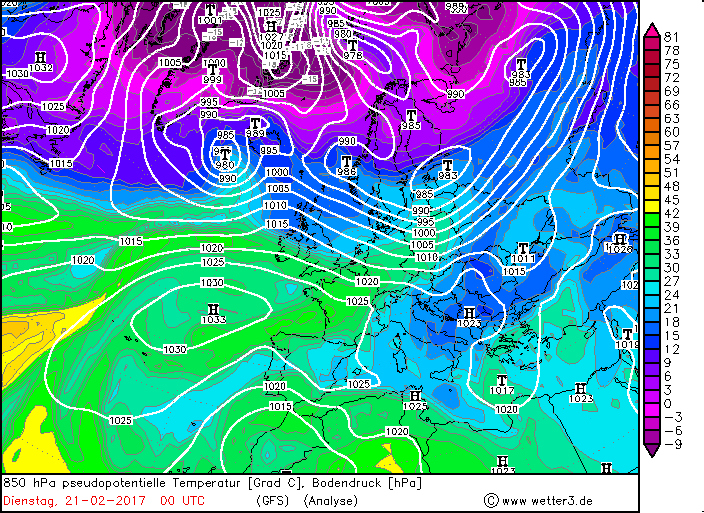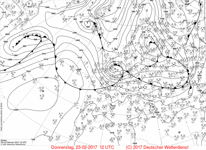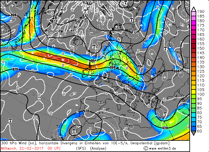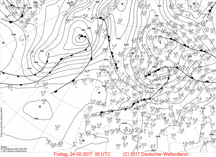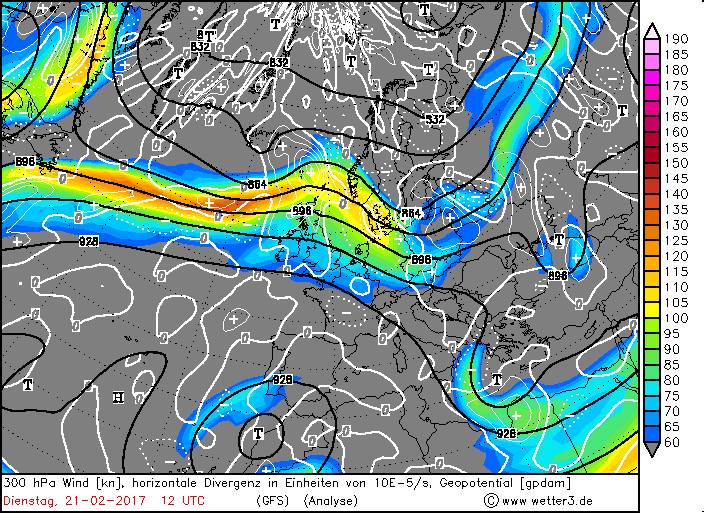 Wetterlage und Entwicklung Zur Monatsmitte des Februars 2017 dominierte mit "Erika" ein kräftiges Hochdruckgebiet das Wettergeschehen in Mitteleuropa. Am 16.02. schob sich der zugehörige Rücken weiter in den Osten Europas, sodass vom Atlantik ein Höhentrog nach Mitteleuropa vorstoßen konnte. Der Trog kam in der Folge weiter in den Südosten Europas voran. Am Boden stellte sich erneut hoher Luftdruck (Hoch "Felicitas") ein. Mit Tief "Querkin", welches vom 16.02. bis zum 18.02. vom Nordwestatlantik bis nach Norwegen zog, veränderte sich das Strömungsmuster über dem nördlichen Mitteleuropa allmählich. Über Nordeuropa entwickelte sich nach dem Durchzug von "Querkin" eine kräftige Frontalzone, die durch einen Warmluftvorstoß über dem Atlantik (10 °C in 850 hPa bei ca. 52 °N) verstärkt wurde. Tief "Rolf" bezog die erwähnten warmen, subtropischen Luftmassen in seine Zirkulation mit ein und verlagerte sich am 19.02. und 20.02. zunächst von Island bis in die Mitte Norwegens. Dabei erreichte der Druckgradient zwischen dem Azorenhoch (1030 hPa) und "Rolf" ca. 40 hPa. Der Jetstream reichte am 20.02. mit einem Maximum von 130 kn (240 km/h) von Neufundland über den Atlantik und Skandinavien bis weit in den Osten Russlands. In dieser fast schon geradlinigen Westströmung waren die Entstehungsbedingungen für Sturmtiefs sehr günstig. Ein Kaltluftvorstoß westlich von Grönland ließ an diesem Tag über dem Nordatlantik Tief "Stefan" entstehen. Hebung an der Vorderseite des zugehörigen Höhentroges sorgte für einen raschen Druckfall im Zentrum des Tiefs (ca. 20 hPa in 24 Stunden). "Stefan" zog von Island über das Nordmeer in Richtung Skandinavien. Starke Divergenz in der Höhe im Ausströmbereich des Jetstreams an der Südostflanke von "Stefan" sorgte am 22.02. für die Entstehung eines zweiten Zentrums über Südschweden. Über Skandinavien liegend hatte das Tiefdruckgebiet seinen Entwicklungshöhepunkt erreicht und schwächte sich nachfolgend bei leichter nördlicher Verlagerung zunehmend ab. Nach Sturmtief "Stefan" befand sich die Frontalzone weiter im Süden als zuvor. Kräftige Höhenwinde herrschten von Großbritannien über die Nordsee bis nach Deutschland und Polen vor.