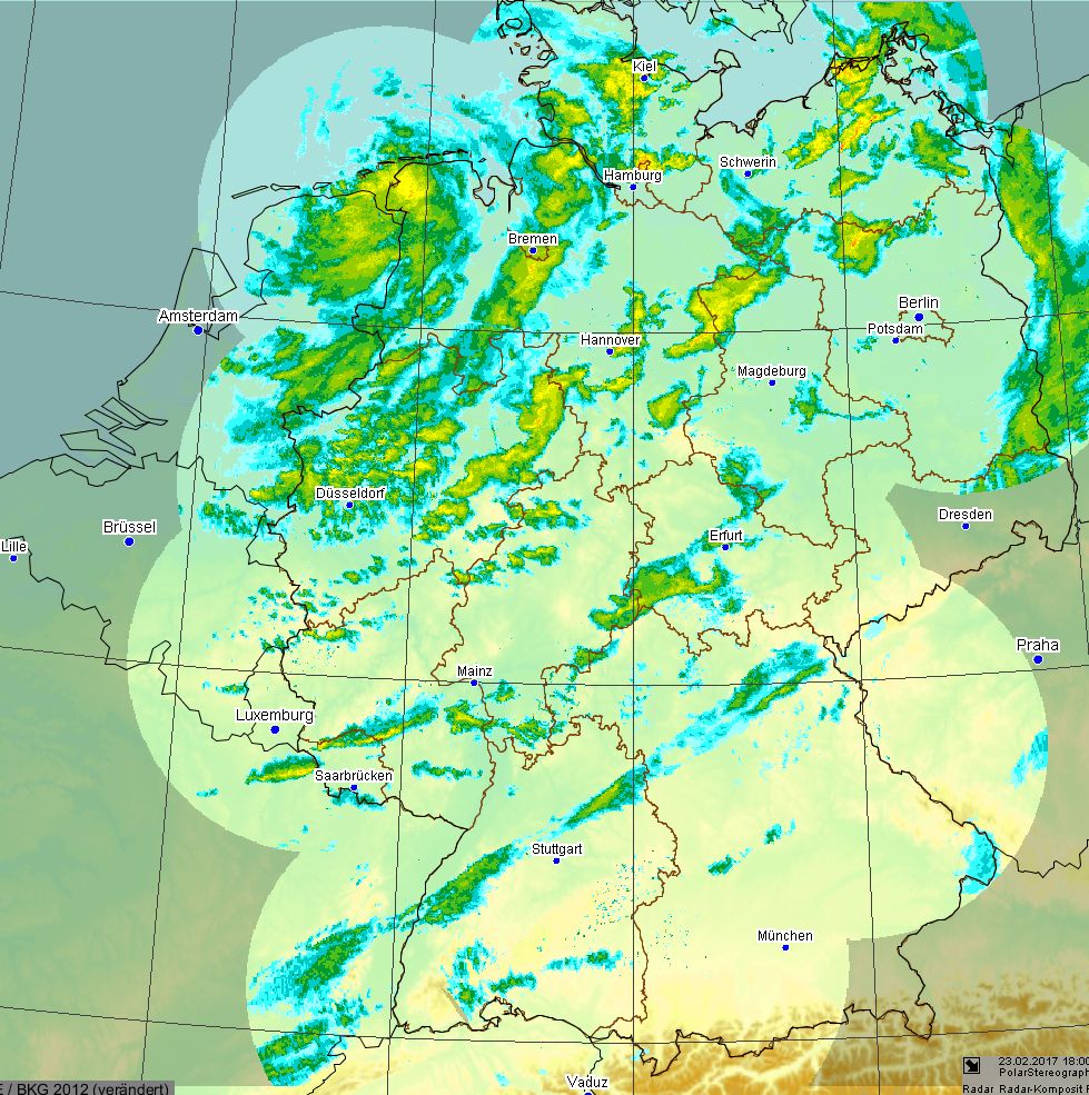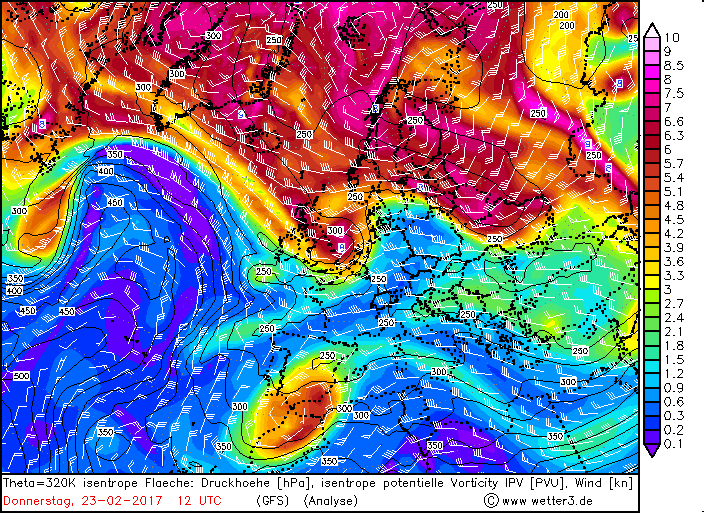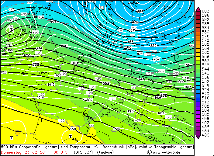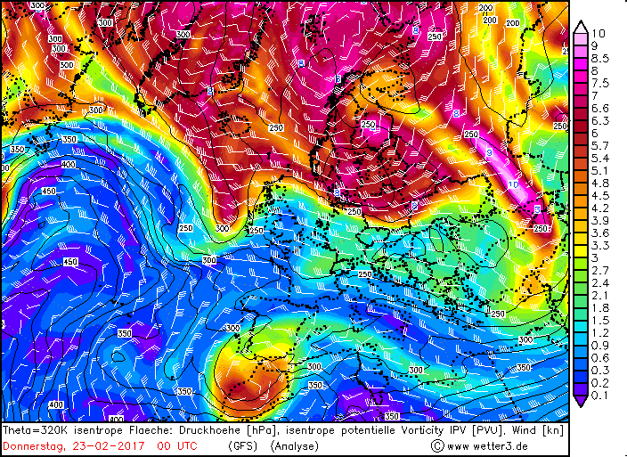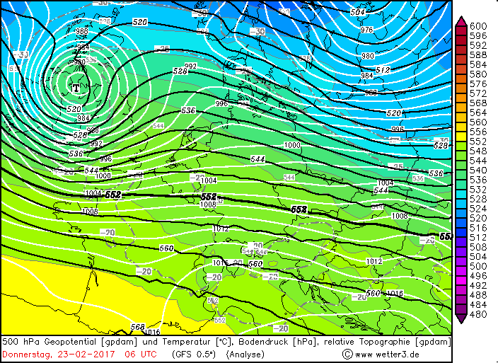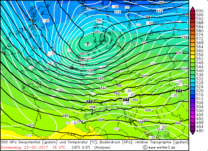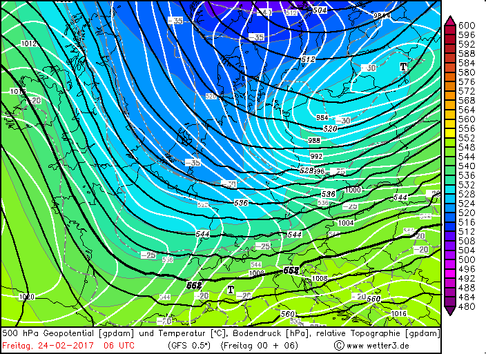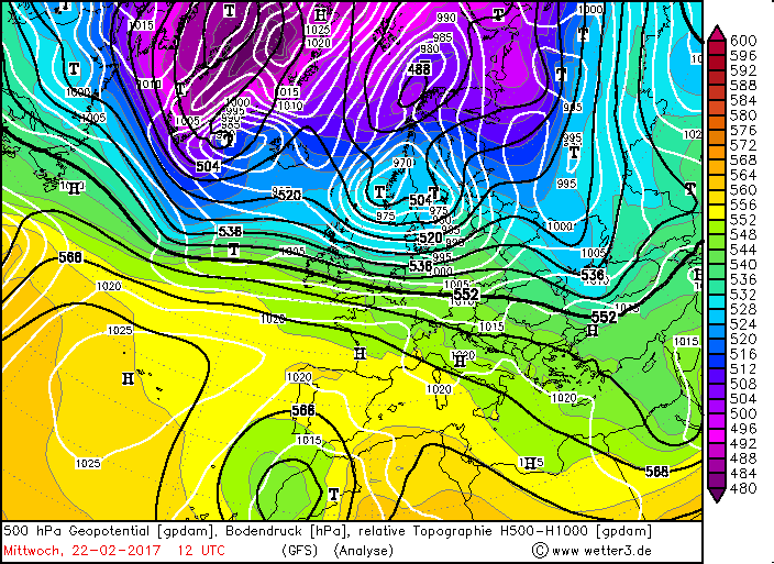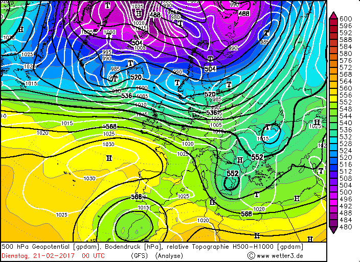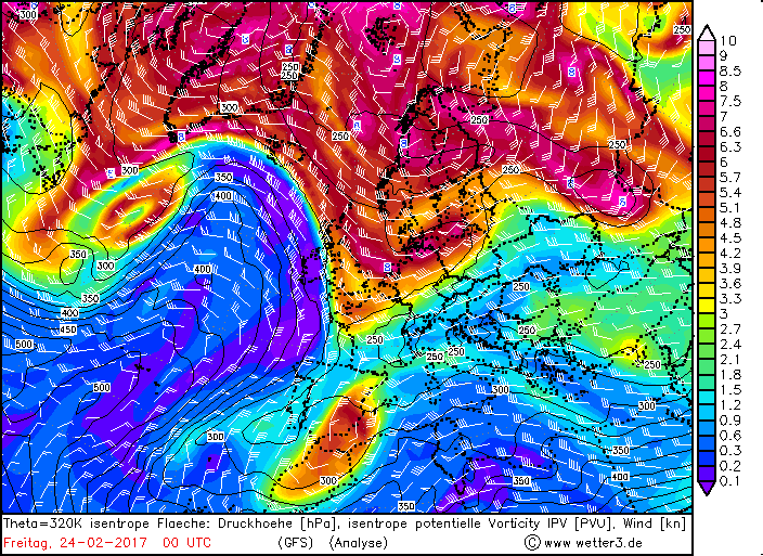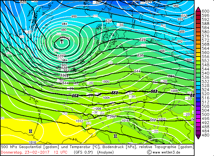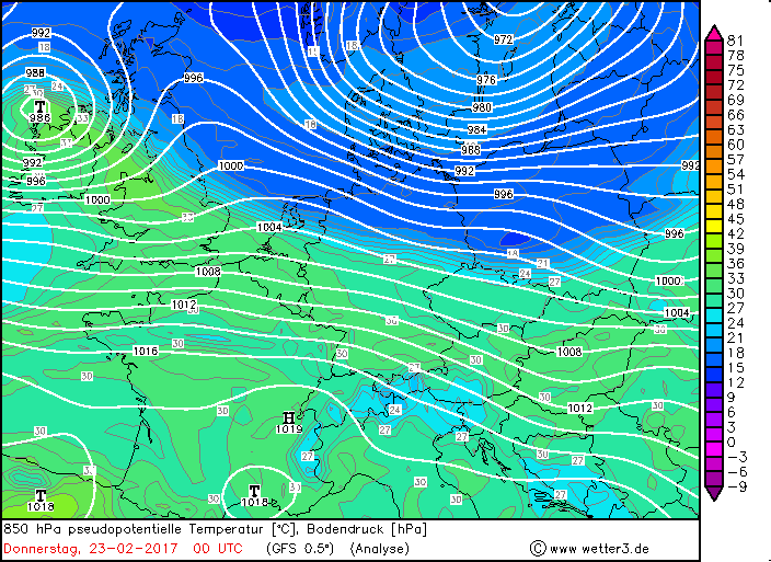 Wetterlage und Entwicklung Zur Monatsmitte des Februars 2017 dominierte mit "Erika" ein kräftiges Hochdruckgebiet das Wettergeschehen in Mitteleuropa. Am 16.02. schob sich der zugehörige Rücken weiter in den Osten Europas, sodass vom Atlantik ein Höhentrog nach Mitteleuropa vorstoßen konnte. Der Trog kam in der Folge weiter in den Südosten Europas voran. Am Boden stellte sich erneut hoher Luftdruck (Hoch "Felicitas") ein. Mit Tief "Querkin", welches vom 16.02. bis zum 18.02. vom Nordwestatlantik bis nach Norwegen zog, veränderte sich das Strömungsmuster über dem nördlichen Mitteleuropa allmählich. Über Nordeuropa entwickelte sich nach dem Durchzug von "Querkin" eine kräftige Frontalzone, die durch einen Warmluftvorstoß über dem Atlantik (10 °C in 850 hPa bei ca. 52 °N) verstärkt wurde. Tief "Rolf" bezog die erwähnten warmen, subtropischen Luftmassen in seine Zirkulation mit ein und verlagerte sich am 19.02. und 20.02. zunächst von Island bis in die Mitte Norwegens. Dabei erreichte der Druckgradient zwischen dem Azorenhoch (1030 hPa) und "Rolf" ca. 40 hPa. Der Jetstream reichte am 20.02. mit einem Maximum von 130 kn (240 km/h) von Neufundland über den Atlantik und Skandinavien bis weit in den Osten Russlands. In dieser fast schon geradlinigen Westströmung waren die Entstehungsbedingungen für Sturmtiefs sehr günstig. Ein Kaltluftvorstoß westlich von Grönland ließ an diesem Tag über dem Nordatlantik Tief "Stefan" entstehen. Hebung an der Vorderseite des zugehörigen Höhentroges sorgte für einen raschen Druckfall im Zentrum des Tiefs (ca. 20 hPa in 24 Stunden). "Stefan" zog von Island über das Nordmeer in Richtung Skandinavien. Starke Divergenz in der Höhe im Ausströmbereich des Jetstreams an der Südostflanke von "Stefan" sorgte am 22.02. für die Entstehung eines zweiten Zentrums über Südschweden. Über Skandinavien liegend hatte das Tiefdruckgebiet seinen Entwicklungshöhepunkt erreicht und schwächte sich nachfolgend bei leichter nördlicher Verlagerung zunehmend ab. Nach Sturmtief "Stefan" befand sich die Frontalzone weiter im Süden als zuvor. Kräftige Höhenwinde herrschten von Großbritannien über die Nordsee bis nach Deutschland und Polen vor.