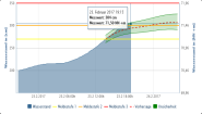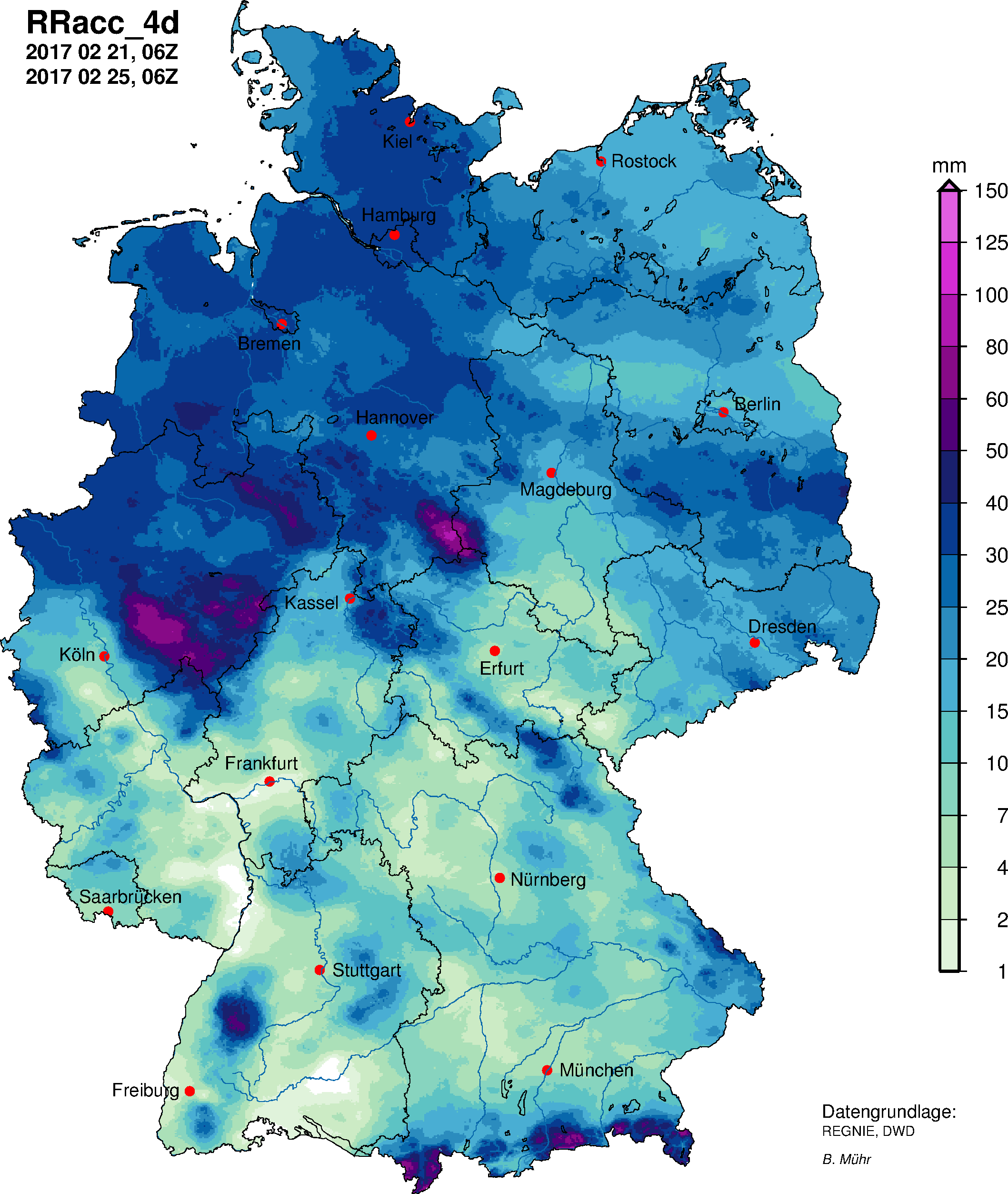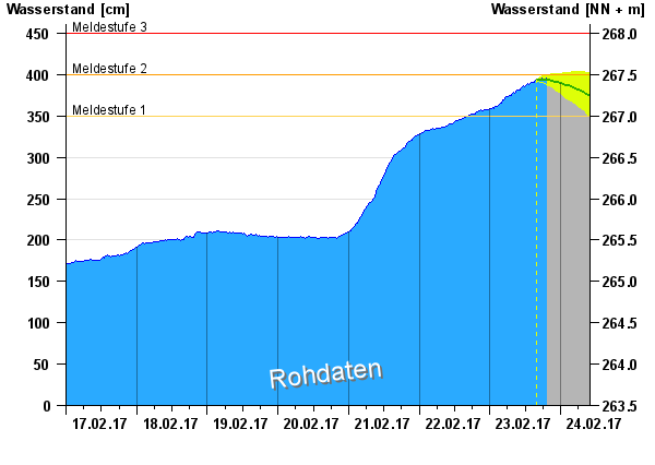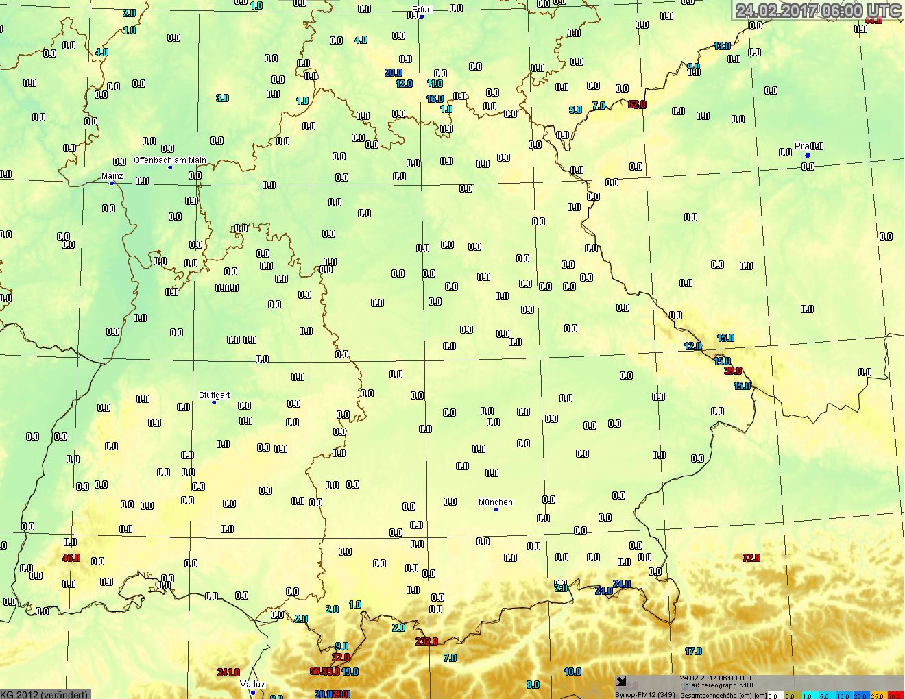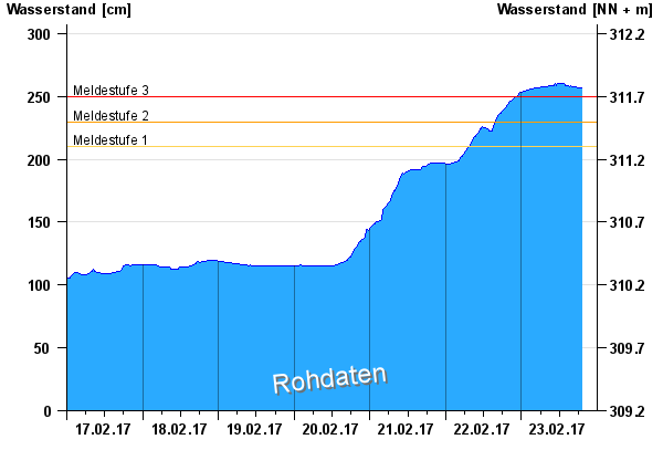 Tauwetter in den deutschen Mittelgebirgen Die über dem Atlantik von den Azoren aus weit nach Norden vorstoßende Warmluft (s. oben) wurde an den Vorderseiten der Tiefs "Rolf" und "Stefan" bis nach Mitteleuropa transportiert. Temperaturen von über 0 °C in Höhen bis über 1500 m in Verbindung mit Regen wechselnder Intensität resultierten in Tauwetter in den Hochlagen der deutschen Mittelgebirgen. Schneehöhen von ca. 20 cm bis 45 cm (auf dem Fichtelberg auch über 70 cm) schrumpften binnen drei Tagen auf ca. 0 cm bis 20 cm (auf den Gipfeln auf ca. 30 cm - 60 cm). Zu dem geschmolzenen Wasser kamen noch kräftige Regenfälle ausgelöst durch die durchziehenden Sturmtiefs hinzu. Am 20.02. regnete es entlang der Kaltfront von Tief "Rolf" vor allem im Bayerischen Wald und Thüringer Wald kräftig. In Schmücke im Thüringer Wald kamen 26,0 mm Niederschlag bis 07 Uhr am 21.02. zusammen. Am 22.02. verzeichneten einige Orte um den Brocken im Harz die höchtsen Regenmengen (Braunlage: 52,1 mm in 24 Stunden bis 23.02. 07 Uhr). Durch das Tauwetter und die Regenfälle kam es zu kleinerem Hochwasser im Umfeld der Mittelgebirgen. Am meisten Flüsse traten in Bayern, Sachsen, Niedersachsen und Thüringen über die Ufer. In Bayern war vor allem das Gebiet um den Fluss Regen, sowie der Oberlauf des Mains betroffen. Der Wasserstand der Steinach in Fürth am Berg stieg binnen drei Tagen um ca. 1,50 an. Die dritte Meldestufe wurde dadurch aufgrund des Pegelstands von über 2,50 m erreicht. In Niedersachsen lag der Pegelstand der Leine teilweise oberhalb der zweiten Hochwassermeldestufe. Zu größeren Schäden durch das Hochwasser kam es nicht.