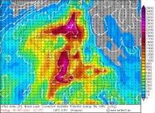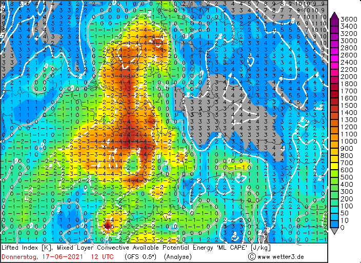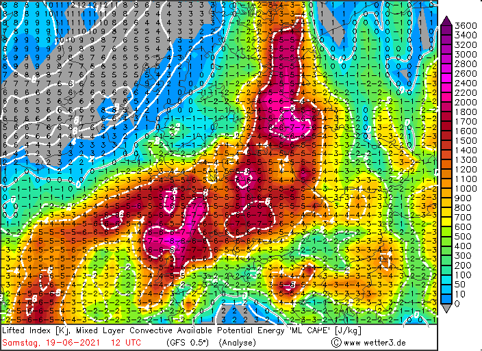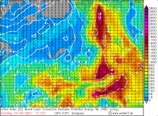 On Saturday and Sunday, the ML-CAPE (Mixed Layer Convective Potential Available Energy) reached values around 2000 J/kg, locally