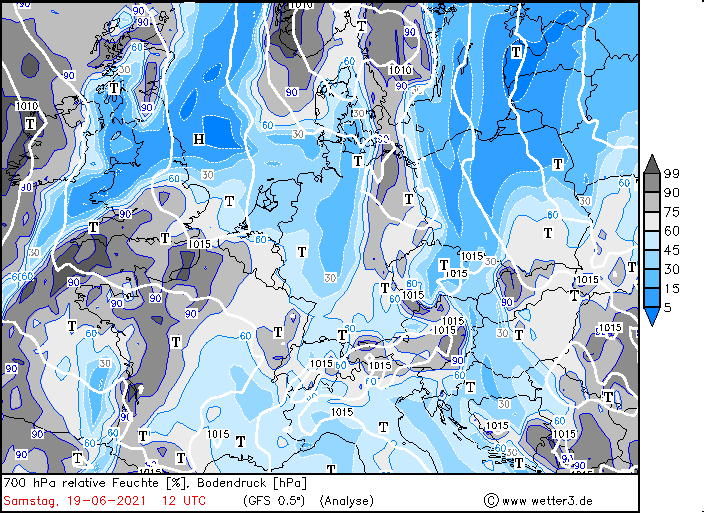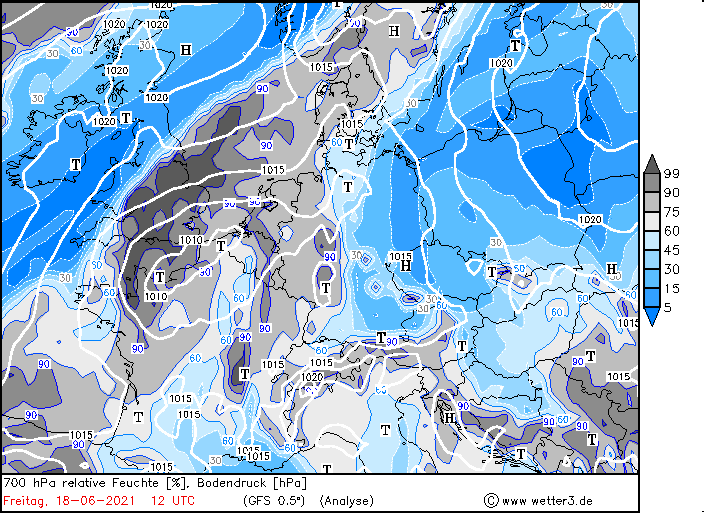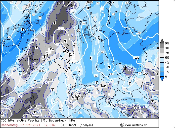 ML-CAPE and 700hPa relative humidity from 17 to 20 June, 12 UTC, source: